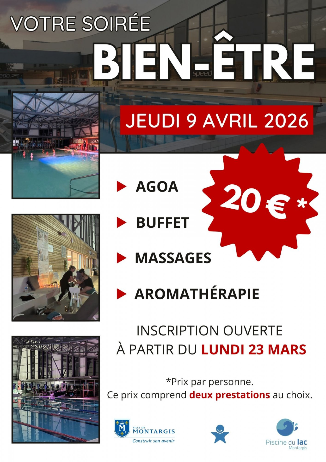 Bassin sportif : 12:00 - 20:00 | Bassin ludique : 12:00 - 12:30 et 14:00 - 18:00 | Bien-être : 12:00 - 19:45